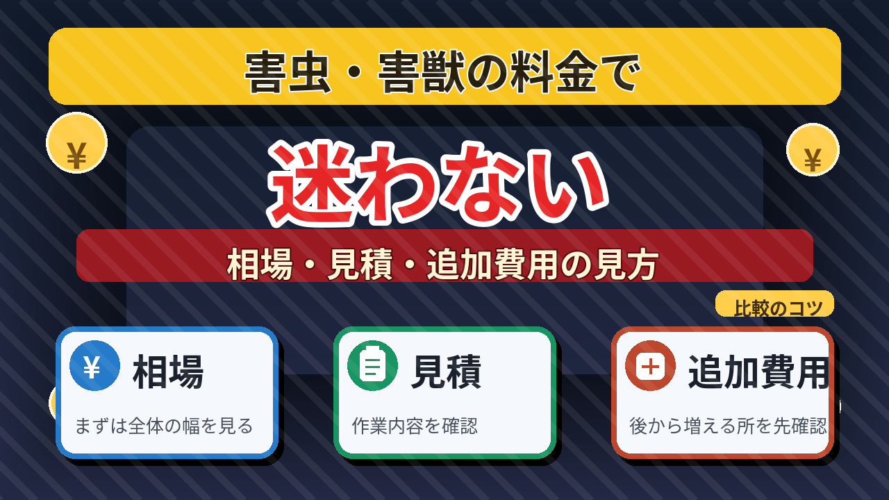 駆除の相場は「安い/高い」より、作業範囲・追加費用の条件・再発対応の条件で決まります。見積もり前に見る3つと、聞き方テンプレで迷いを減らします。