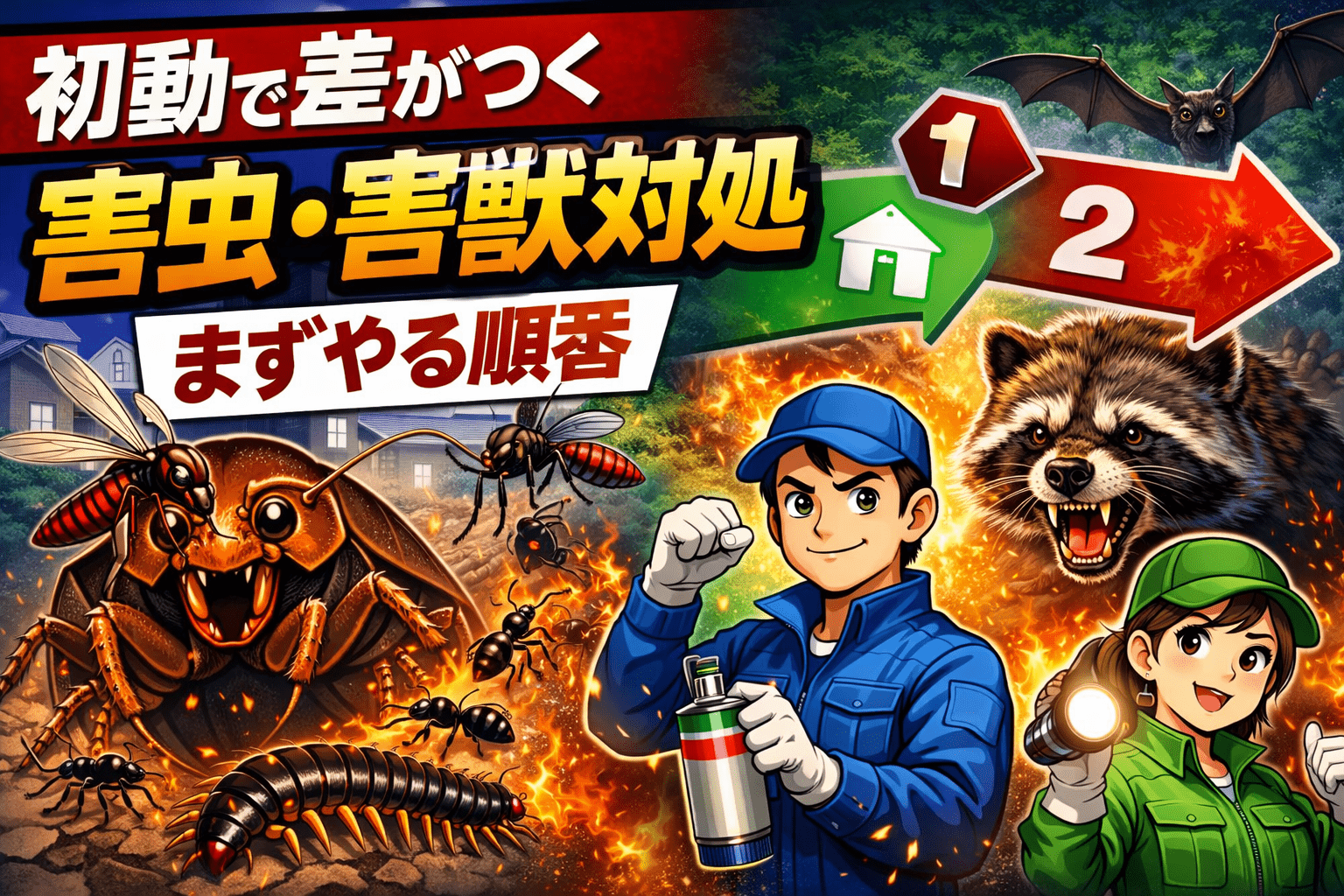 虫・音・フンなど「何か出た」直後に焦って動くと、見失い・不安・手戻りが増えやすい。触らない範囲、場所の固定、状況を一行にするコツまで、最初の10分の順番を整理。